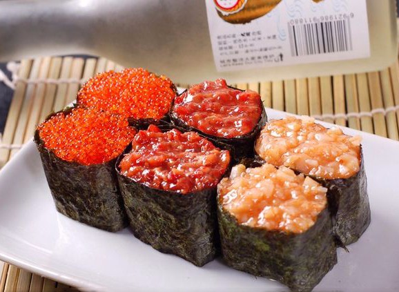 军舰寿司系列:三文鱼军舰寿司、吞拿鱼军舰寿司、鳗鱼军舰寿司、蟹肉色拉军舰寿司、飞鱼籽军舰寿司、田园培根军舰寿司、香松色拉军舰寿司、甜虾奶酪军舰寿司、鲭鱼青瓜军舰寿司、明太子沙律军舰寿司、金枪鱼沙律军舰寿司、味付螺肉军舰寿司